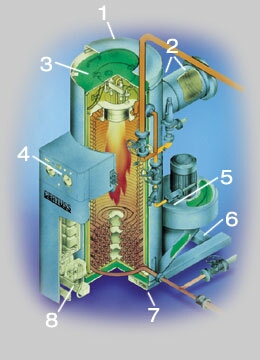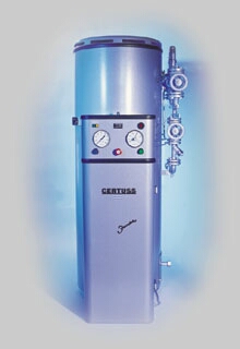 Jesteśmy bezpośrednim i wyłącznym przedstawicielem na Polskę niemieckiej firmy CERTUSS Dampfautomaten GmbH & Co. KG producenta wytwornic pary wraz z urządzeniami towarzyszącymi. Firma CERTUSS w ciągu 40 lat działalności dostarczyła dziesiątki tysięcy wytwornic do wielu krajów świata z tej liczby ponad 300 wytwornic znalazło się w Polsce. ![]() Wytwornica zainstalowana w zakładzie przemysłu chemicznego ![]() Przekrój wytwornicy pary CERTUSS 1 - Odgórne zasysanie powietrza. Lekka osłona z tworzywa sztucznego umożliwiająca łatwą konserwację 2 - Wyraźnie oznakowane króćce kontrolne do wymaganych przepisami pomiarów 3 - Zintegrowany mechanizm blokady do transportu 4 - Światłowodowy układ kontroli płomienia 5 - Zawór rozruchowy CERTUSS zapobiegający błędom obsługi 6 - Zawieszenie dmuchawy amortyzujące wibrację 7 - Łatwodostępny otwór wyczystkowy 8 - Blok regulacyjny CERTUSS ze zintegrowanym układem przeciw zamarzaniu ![]() Wytwornica pary typ ELEKTRO. Ogrzewana energią elektryczną. Zakres wydajności 8 - 97 kg pary/h ![]() Wytwornica pary typ JUNIOR. Opalana olejem lub gazem. Zakres wydajności 80 - 600 kg pary/h ![]() Wytwornica pary typ UNIVERSAL. Opalana olejem lub gazem. Zakres wydajności 700 - 1800 kg pary/h Posiadamy w swej ofercie także wytwornice używane. ![]() Wytwornica pary CERTUSS typ JUNIOR |