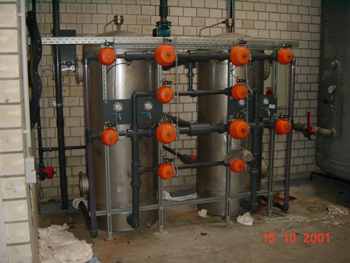 Jesteśmy bezpośrednim i wyłącznym przedstawicielem na Polskę niemieckiej firmy KARL SPIEGL GmbH & Co. producenta urządzeń do uzdatniania wody. Urządzenia firmy SPIEGL pracują z powodzeniem u wielu użytkowników zarówno uzdatniając wodę na potrzeby kotłowni jak i do celów technologicznych i użytkowych. Program produkcji firmy SPIEGL obejmuje: - stacje zmiękczania wody z wymiennikami jonitowymi regenerowanymi solą kuchenną o wydajnościach od 0,5 do 20m3/h. Woda zmiękczona może osiągnąć twardość resztkową 0,1 dH, co umożliwia wykorzystanie jej do zasilania kotłów jak i innych zastosowań wymagających wody o bardzo niskiej twardości. Mogą być to stacje jedno- lub dwukolumnowe (te ostatnie są przeznaczone do pracy ciągłej). Stacje mogą być wyposażone w jeden z trzech rodzajów sterowania: czasowe, licznikiem przepływu wody, miernikiem twardości wody. Istnieje możliwość dostawy stacji w specjalnym wykonaniu do zmiękczania wody o wysokiej temperaturze, - stacje usuwania twardości węglanowej wody z wymiennikami regenerowanymi kwasem solnym, - urządzenia do uzdatniania wody metodą odwróconej osmozy. Metoda ta pozwala na zmniejszenie zawartości soli i składników mineralnych o 98%. Charakteryzuje się brakiem zapotrzebowania na dodatkowe środki chemiczne do regeneracji oraz brakiem szkodliwych ścieków. Modułowa budowa tych urządzeń umożliwia ich wykonanie w zakresie wydajności od 15 l/h do kilkudziesięciu m3/h, - urządzenia do sterylizacji wody promieniami ultrafioletowymi, - filtry zgrubne wody w wykonaniu świecowym i samopłuczącym, - urządzenia filtracyjne do odżelaziania i odmanganiania wody, - aeratory i deaeratory dla filtrów odżelaziających, - dozowniki chemikaliów. ![]() Zespół filtrów odżelaziających firmy KARL SPIEGL GmbH & Co. |